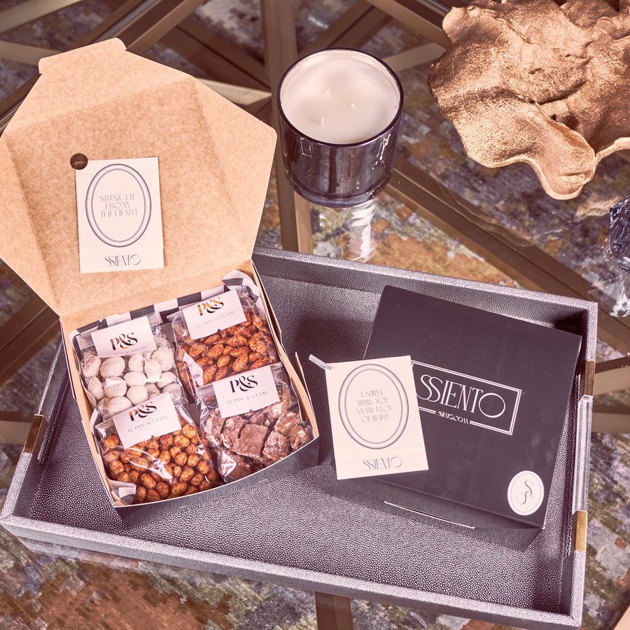 Caja de cartón con 4 bolsitas de botana salada y dulce de pan y la sal