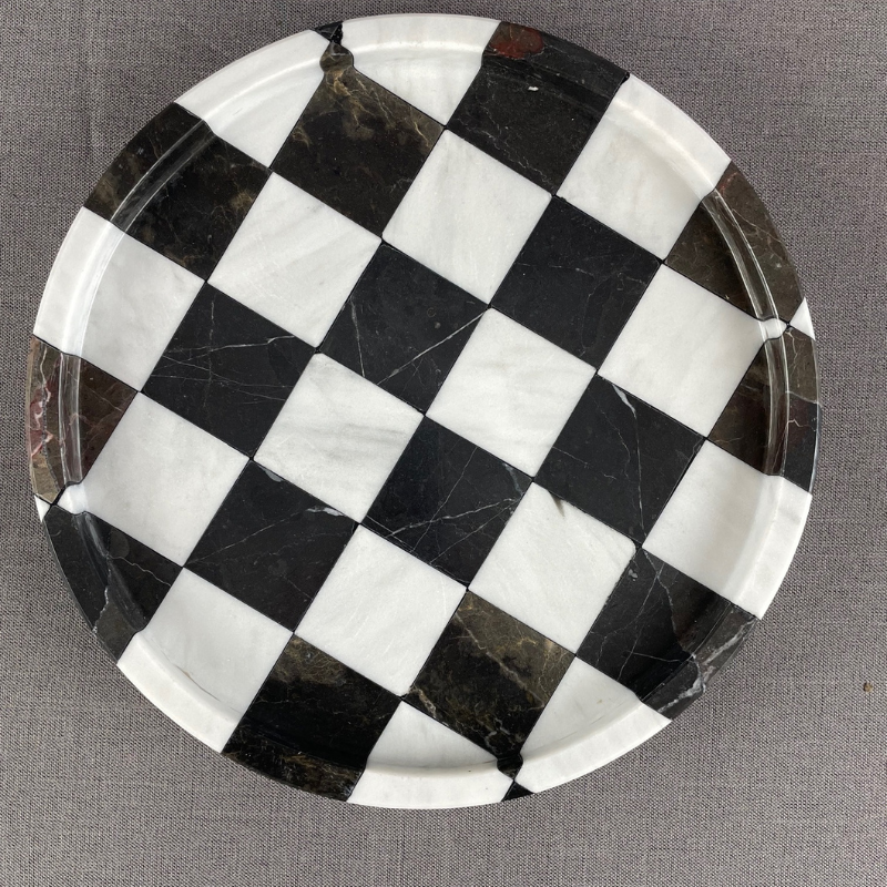 Esta charola, inspirada en el tablero de ajedrez. Hecha en mármol con medidas de: 30 cm