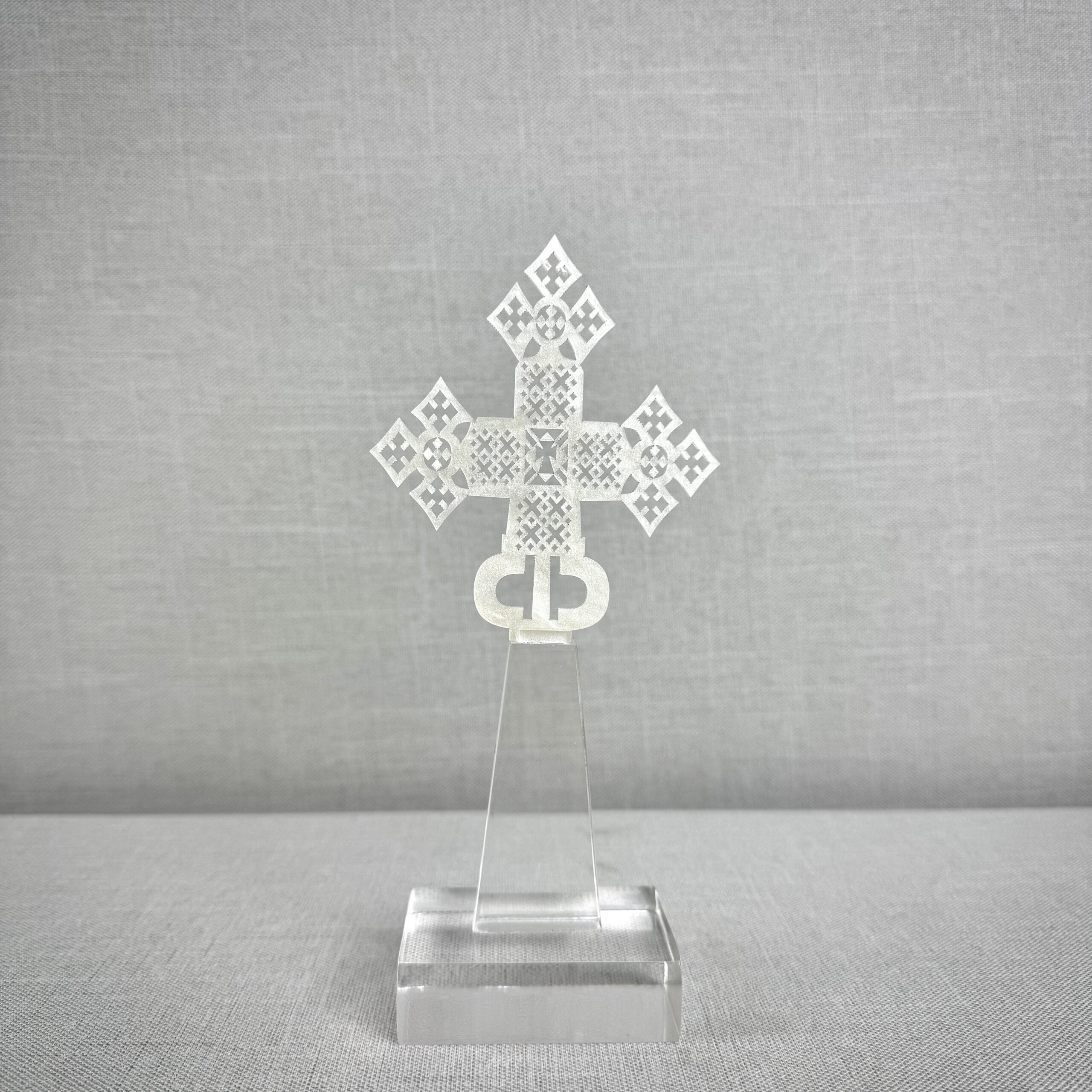 Cruz mini de acrílico, ideal como recuerdo en sacramentos. Mide 11 cm (17 cm con base).