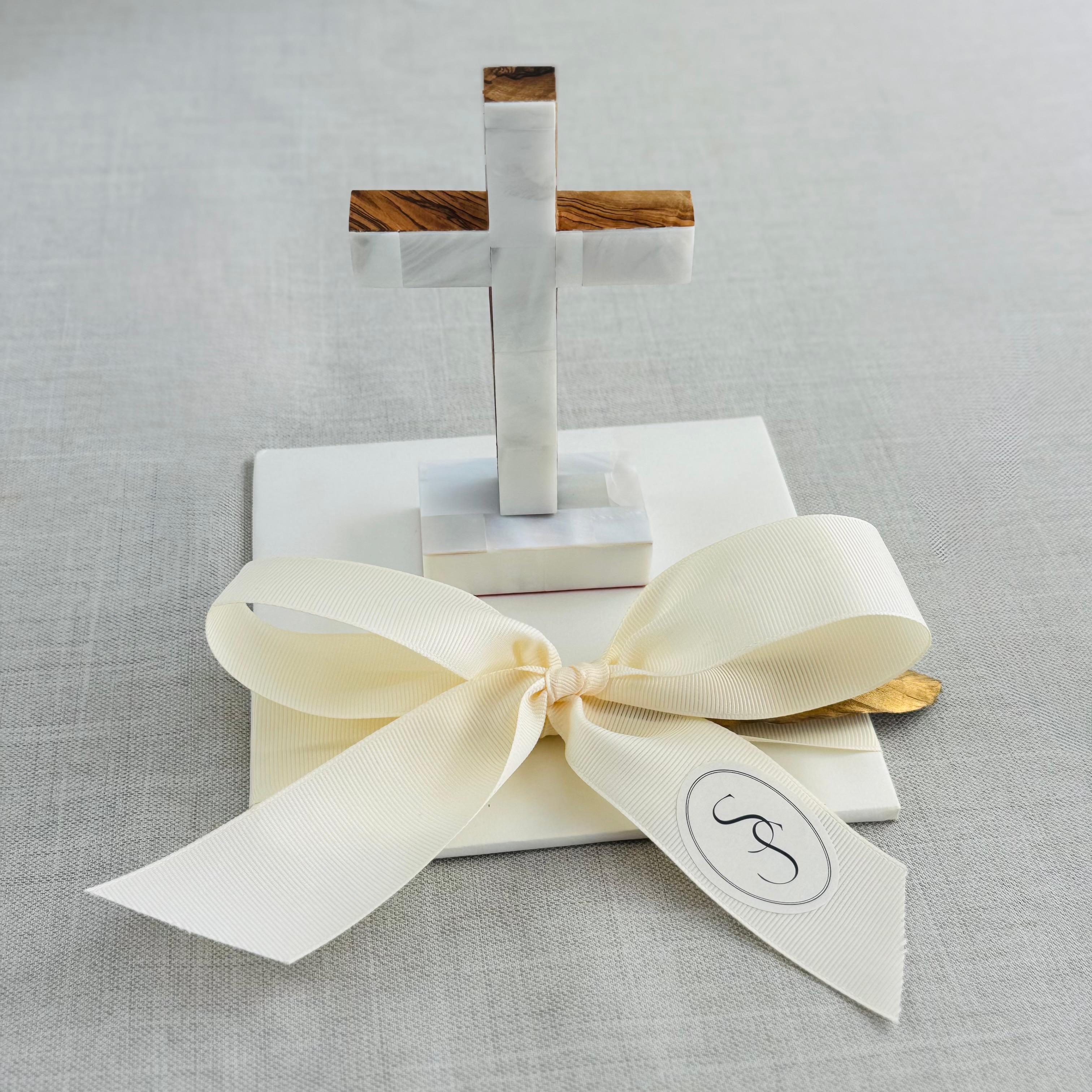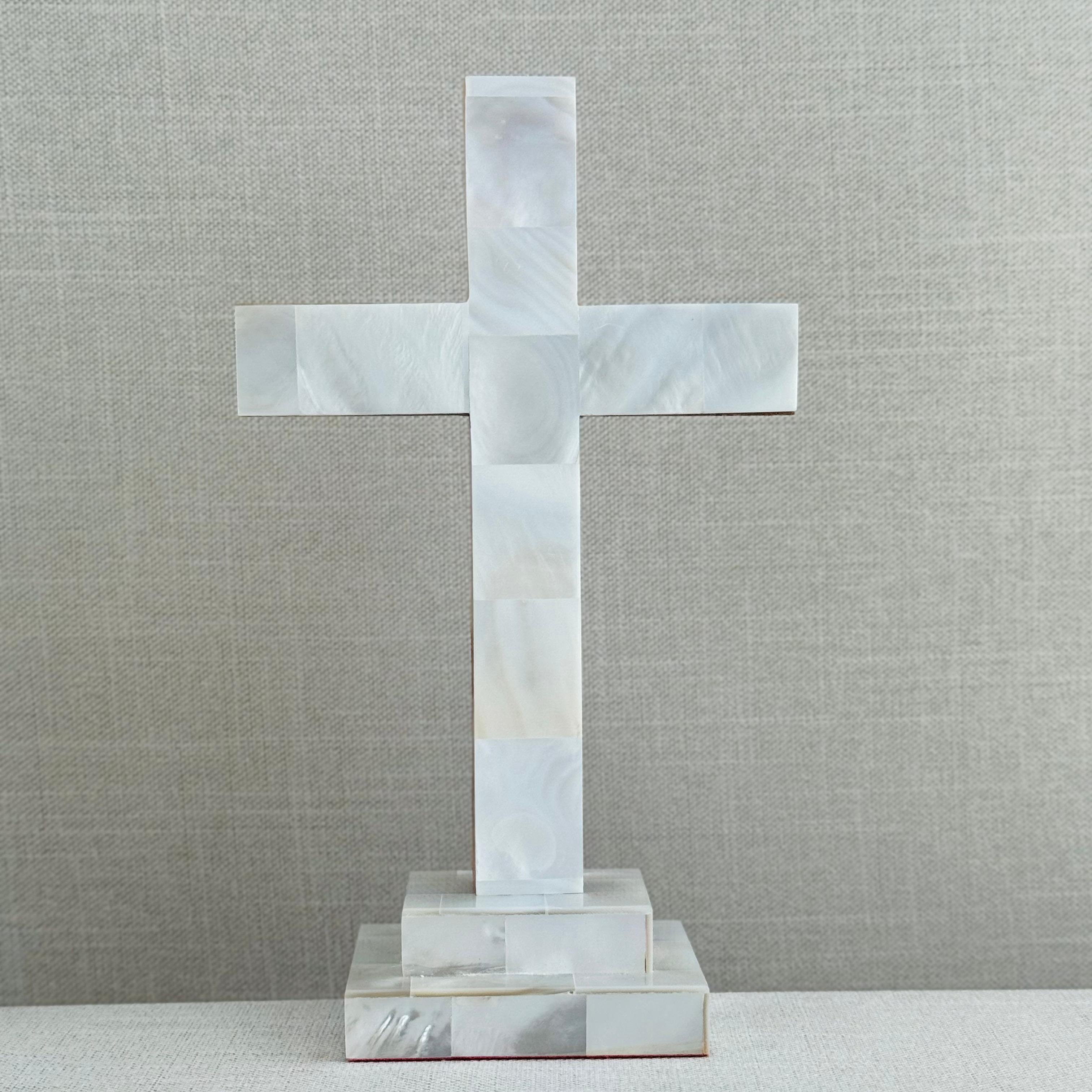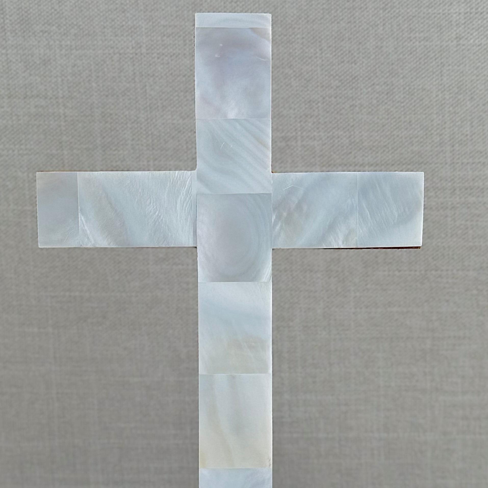 Hermosa cruz hecha de madera de olivo con madre perla traída de Tierra Santa.