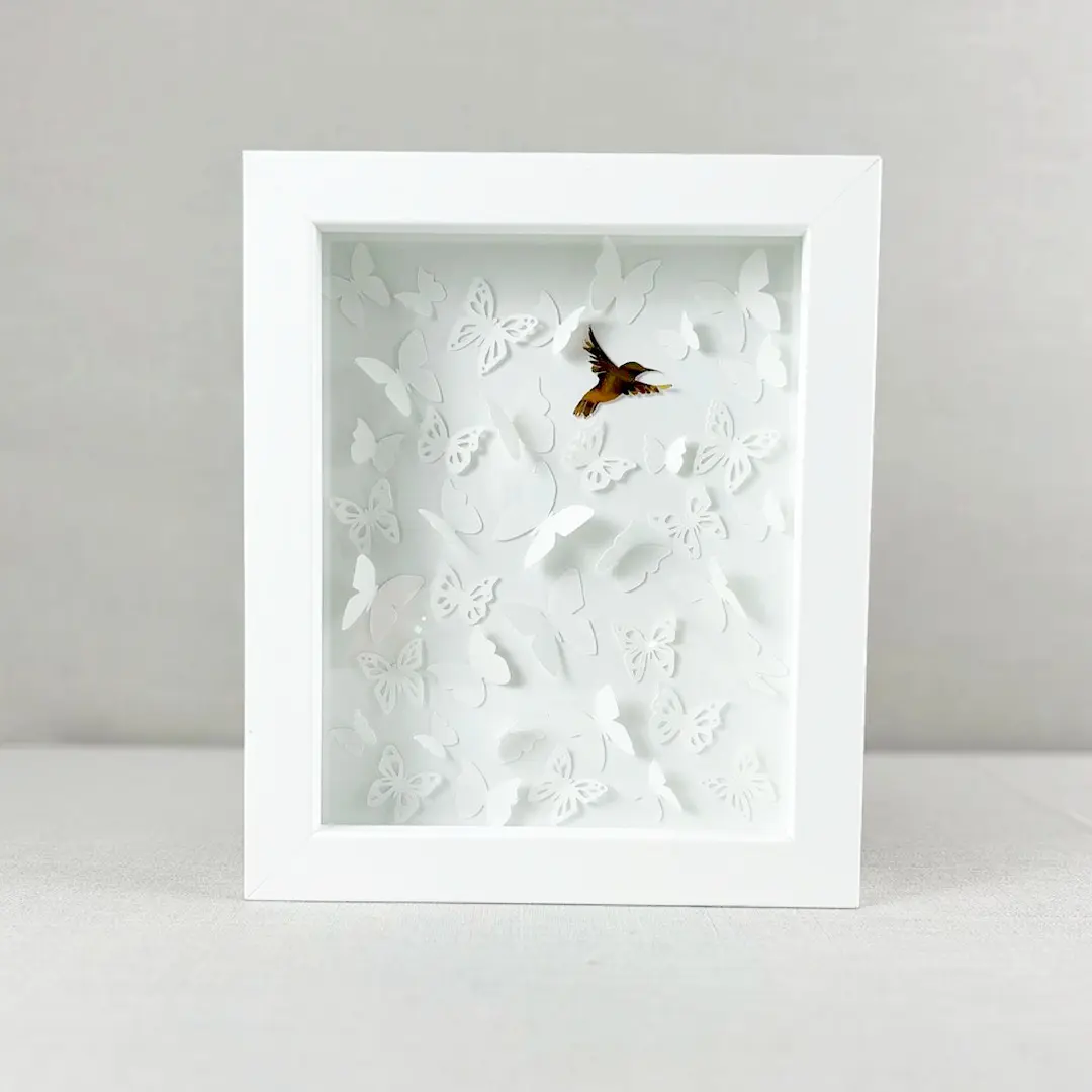 Este cuadro hecho a mano captura la magia de la naturaleza con un colibrí y varias mariposas delicadamente elaborados en papel. Enmarcada en madera con vidrio protector y un fondo de lino que realza su belleza.