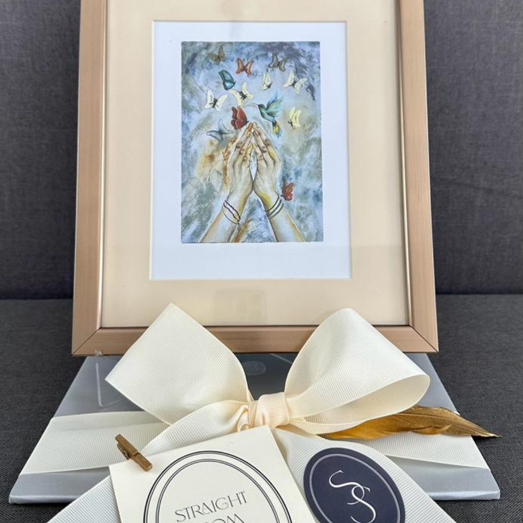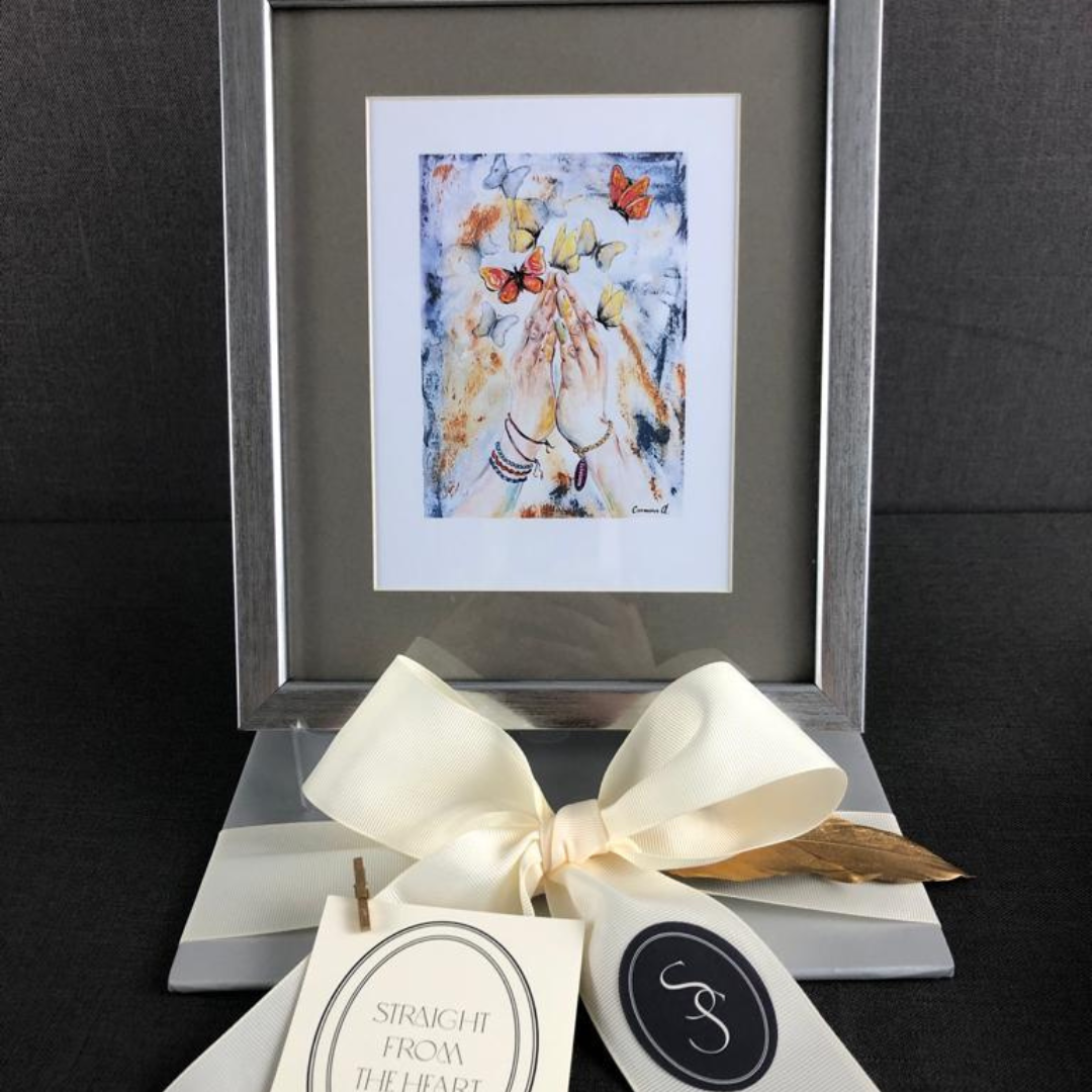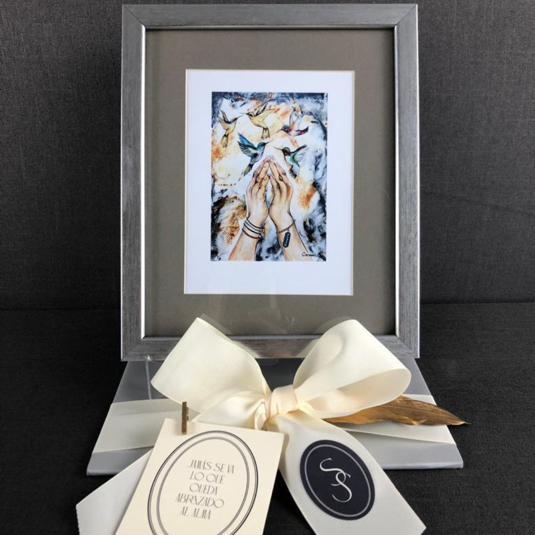 Pinturas de manos con colibrí y/o mariposa de Carmina Alcalá. Pedestal de acrílico a escoger.