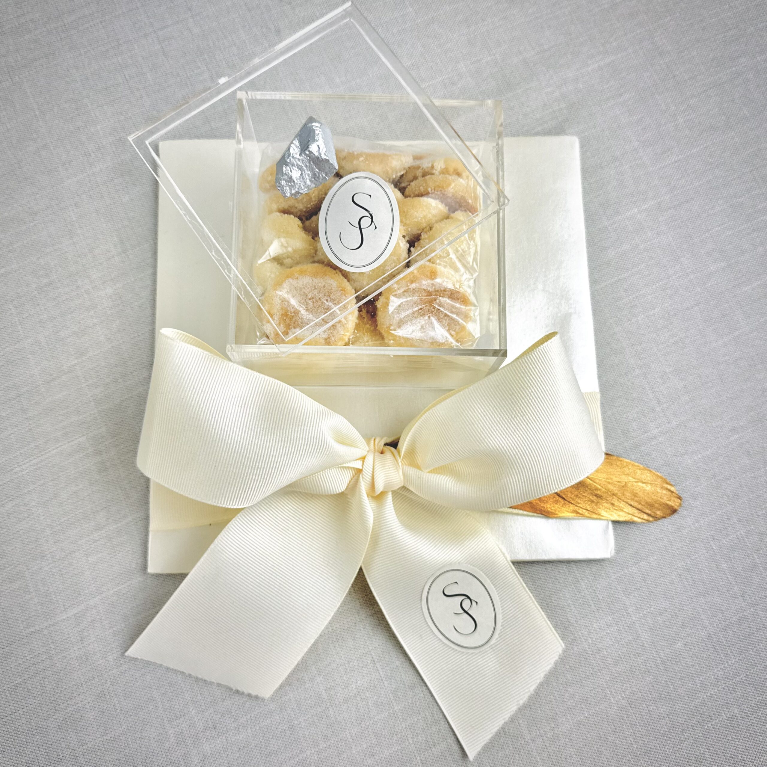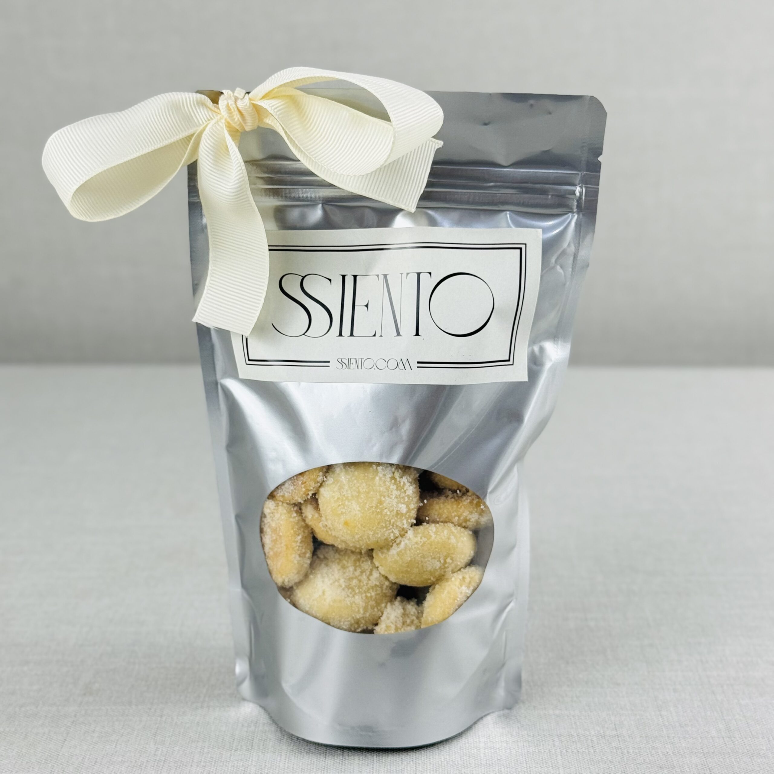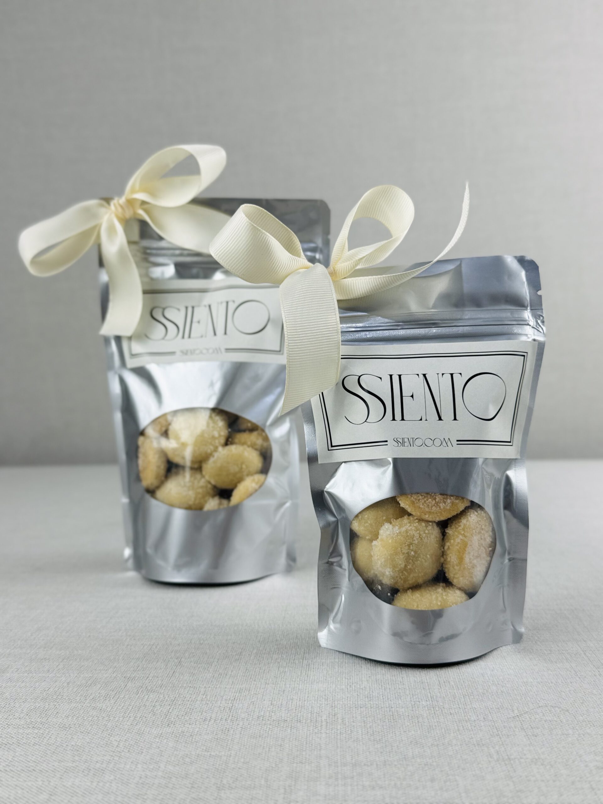Galletas artesanales de mantequilla con azúcar, hechas a mano. Disponibles en bolsa, caja de acrílico o caja doble (Polvorones y Chicloso), en presentaciones de 100 g y 250 g.