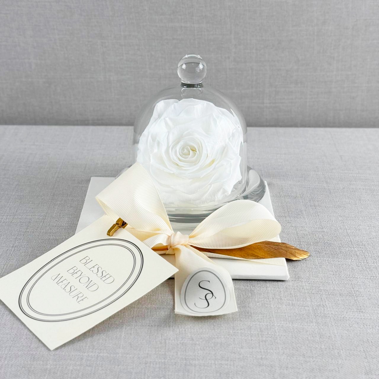 Elegante capelo de acrílico transparente con base de madera, que resguarda una delicada rosa preservada de larga duración(color a elegir).