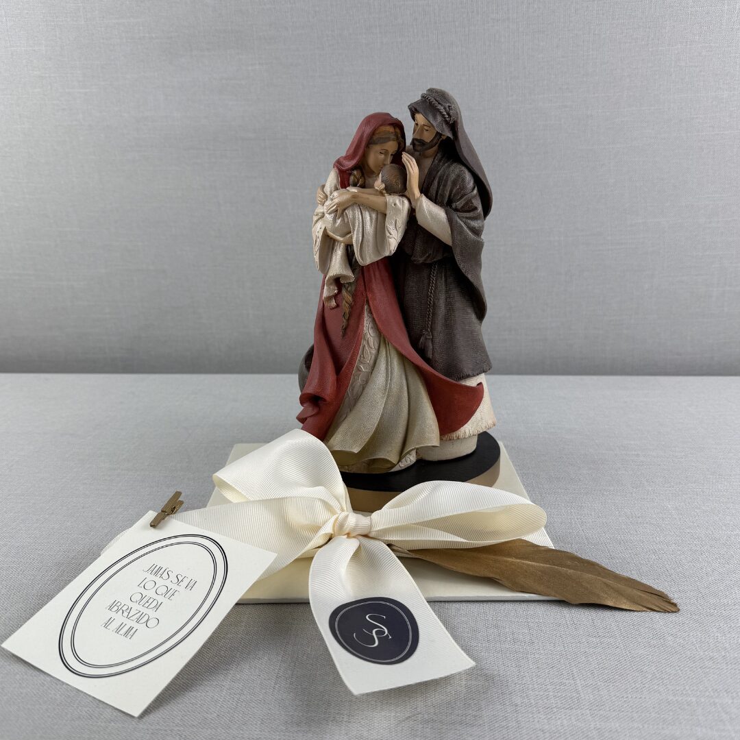 Figura de la Sagrada Familia en resina en base de madera. 20 cm.