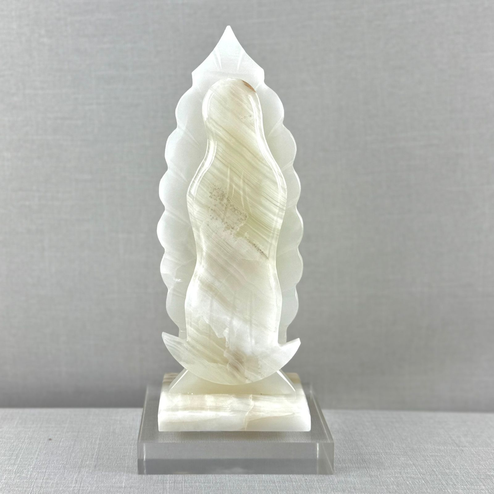 Virgen de Guadalupe de ónix. Elaborada en ónix natural con base de acrílico.